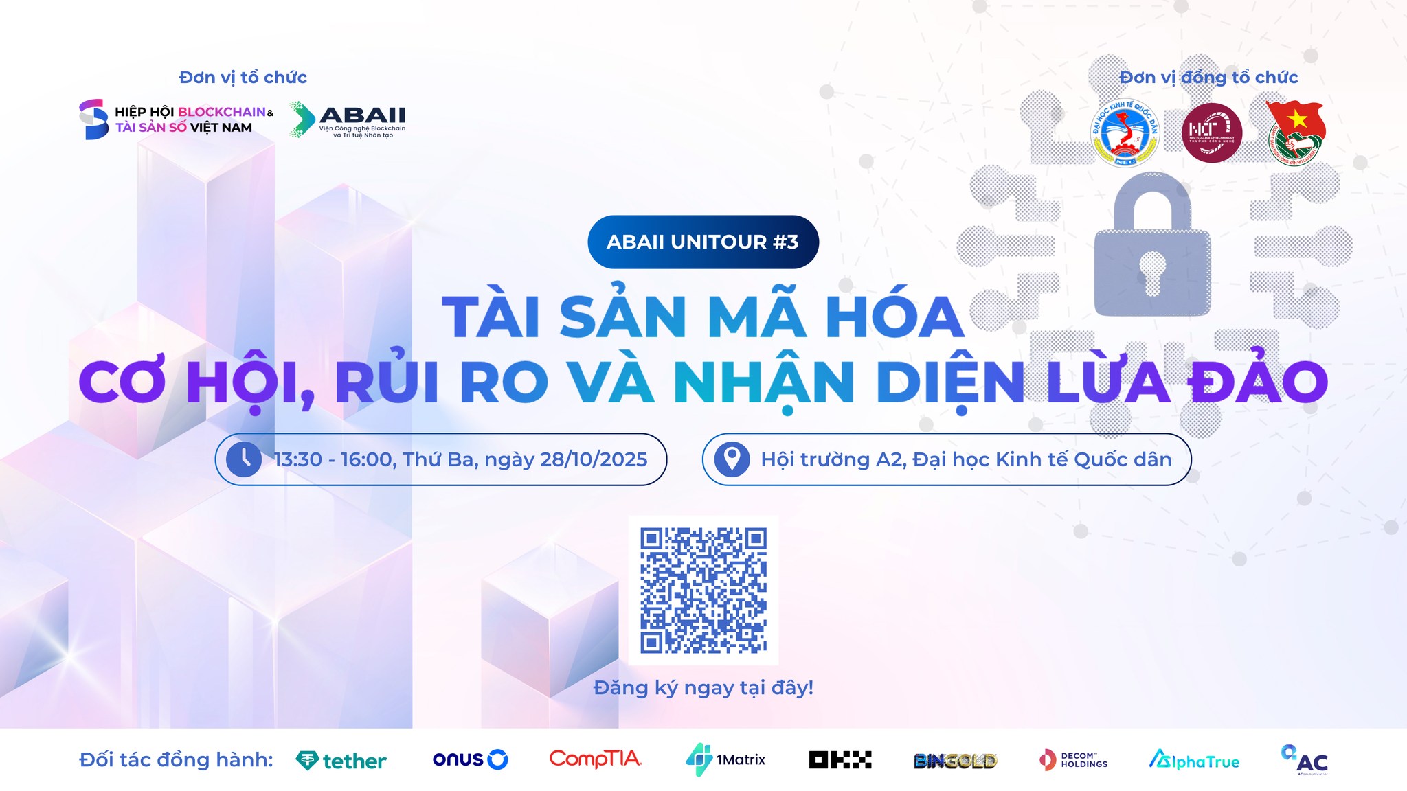 Nhằm giúp sinh viên hiểu đúng và bảo vệ bản thân trong không gian tài chính số, Hiệp hội Blockchain và Tài sản số Việt Nam, Viện Công nghệ Blockchain và Trí tuệ nhân tạo ABAII phối hợp cùng Trường Công nghệ – Đại học Kinh tế Quốc dân (NEU) tổ chức hội thảo “Tài sản mã hóa: Cơ hội, rủi ro và nhận diện lừa đảo”, trong khuôn khổ ABAII Unitour 2025.