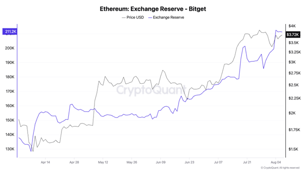 Theo CryptoQuant, tính đến 31/07/2025, dự trữ Ethereum của Bitget đã đạt khoảng 211.200 ETH. Con số này đánh dấu mức tăng đáng kể từ giữa tháng 4, khi dự trữ dao động quanh mức 130.000 ETH. Việc tích lũy ETH liên tục trên nền tảng Bitget phản ánh niềm tin ngày càng tăng từ phía người dùng, khi họ ngày càng lựa chọn lưu trữ tài sản của mình trên sàn giao dịch. Đà tăng trưởng này trùng khớp với đợt bùng nổ thị trường của Ethereum, khi giá đạt đỉnh khoảng 3.720 USD trong tháng. Số lượng ETH gia tăng trên nền tảng cũng cho thấy sự cân bằng lành mạnh giữa tiền nạp của người dùng và hoạt động giao dịch, đồng thời phản ánh thanh khoản mạnh mẽ của nền tảng.