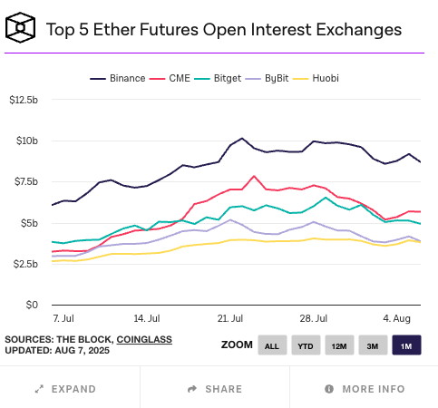 Bitget vẫn duy trì vị thế dẫn đầu trên thị trường phái sinh, đặc biệt là đối với futures dựa trên Ethereum. Theo báo cáo của The Block và Coinglass, Bitget nằm trong Top 3 sàn giao dịch toàn cầu về hợp đồng mở futures Ethereum trong tháng 7. Xu hướng tăng của hợp đồng mở phản ánh tổng số hợp đồng đang tồn tại, cho thấy sự tham gia ngày càng tăng của các tổ chức và cá nhân. Sự tăng trưởng ổn định này có thể được lý giải bởi cơ sở hạ tầng giao dịch tiên tiến, cấu trúc phí cạnh tranh và trải nghiệm người dùng liền mạch của Bitget – tất cả những yếu tố này giúp tạo nên một địa điểm ưa thích cho các nhà giao dịch futures toàn cầu.