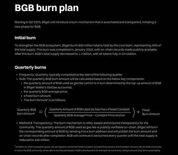 Việc chuyển đổi BGB từ không bắt buộc sang thiết yếu đòi hỏi nhiều hơn là chỉ mở rộng tiện ích. Chúng tôi hiểu rằng một chiến lược cắt giảm nguồn cung mạnh mẽ là yếu tố then chốt trong cơ chế cung ứng của token, do đó giai đoạn đầu tiên đã bắt đầu với các đợt đốt token hàng quý có hệ thống, gắn liền với hiệu suất kinh doanh của Bitget. Không giống như các đợt đốt token mang tính hình thức phổ biến trong ngành, những đợt này thể hiện sự phân bổ vốn đáng kể nhằm cắt giảm nguồn cung. Mỗi quý, 20% lợi nhuận từ hoạt động sàn giao dịch và ví được dùng trực tiếp để mua lại BGB và tiến hành đốt vĩnh viễn.