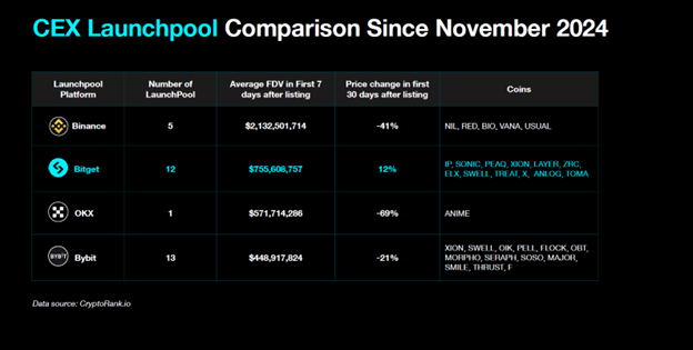 So sánh 30 ngày sau khi ra mắt token: Launchpool của Bitget có mức tăng giá trung bình +12%, trong khi Binance giảm 41%, OKX giảm 69% và Bybit giảm 21%. Đây là sự khác biệt rõ rệt.