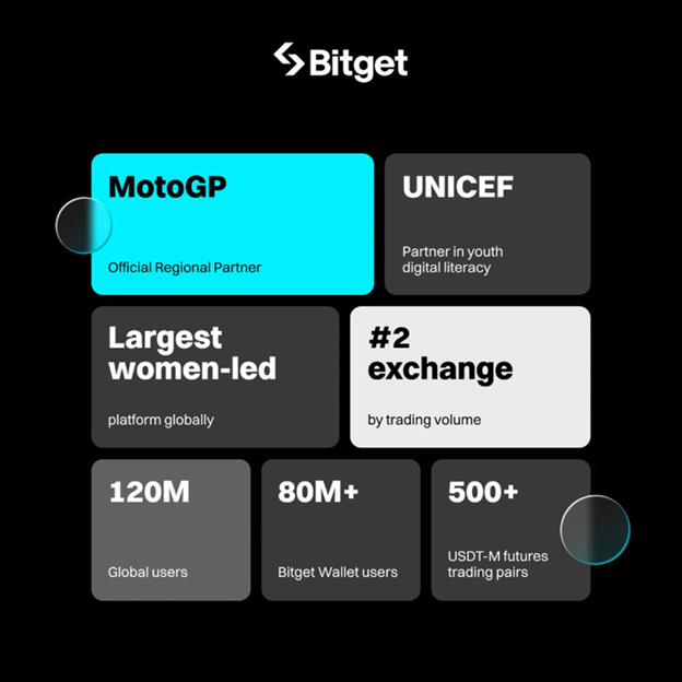 Phù hợp với chiến lược tác động toàn cầu của mình, Bitget đã hợp tác với UNICEF để hỗ trợ giáo dục blockchain cho 1,1 triệu người trước năm 2027. Trong thế giới đua xe thể thao, Bitget là đối tác sàn giao dịch tiền điện tử độc quyền của MotoGP™, một trong những giải vô địch hấp dẫn nhất thế giới.