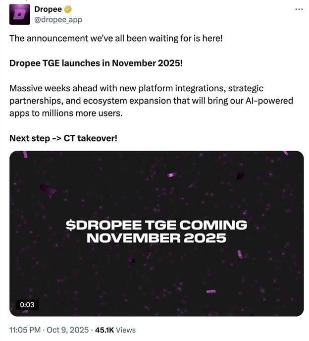 Sự kiện TGE (Token Generation Event) của Dropee dự kiến diễn ra vào tháng 11/2025. Tuy chưa xác nhận ngày niêm yết chính thức, token dự kiến sẽ xuất hiện không lâu sau TGE. Hãy theo dõi các kênh Telegram và X (Twitter) chính thức của Dropee để cập nhật tin tức về ngày niêm yết và các sàn giao dịch sẽ hỗ trợ.