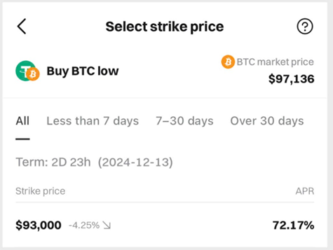 - Nếu giá BTC thấp hơn giá mục tiêu vào ngày đáo hạn, bạn sẽ mua BTC ở mức giá đã chọn và nhận thêm lãi suất APR.