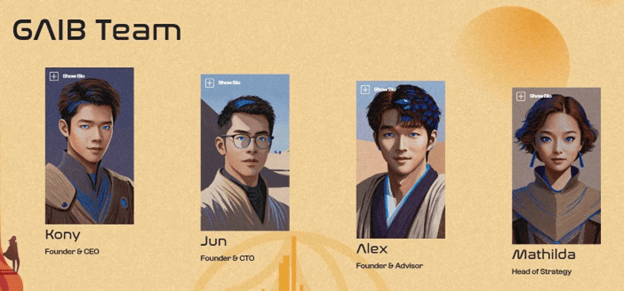 Đội ngũ bao gồm các cựu sinh viên từ Goldman Sachs, Huobi, Ava Labs, Binance Labs, Cornell, Đại học Pennsylvania, Đại học Quốc gia Đài Loan và UCLA. Đội ngũ GAIB bao gồm khoảng 30 thành viên có chuyên môn về phát triển phần mềm, kỹ thuật, tiếp thị, tài chính và phát triển sản phẩm blockchain.
