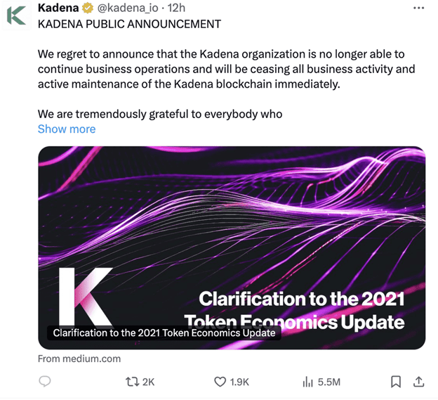 “Chúng tôi rất tiếc phải thông báo rằng tổ chức Kadena không còn khả năng tiếp tục các hoạt động kinh doanh và sẽ ngừng ngay lập tức mọi hoạt động kinh doanh cũng như bảo trì Kadena blockchain.”