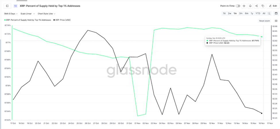 Yếu tố củng cố thêm cho triển vọng tăng giá XRP là áp lực bán từ các nhà đầu tư dài hạn đang liên tục giảm. Dữ liệu on-chain cho thấy, đầu tháng 11, top 1% ví lớn nắm giữ khoảng 87,729% tổng nguồn cung XRP đang lưu hành. Đến giữa tháng, tỷ lệ này chỉ giảm nhẹ còn 87,714%, phản ánh việc bán ra ròng là rất thấp.