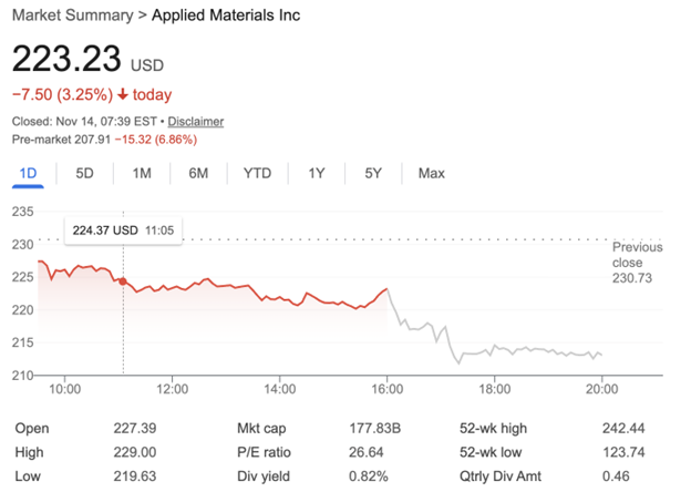 Những năm gần đây Mỹ liên tục siết chặt kiểm soát xuất khẩu thiết bị bán dẫn tiên tiến sang Trung Quốc. Trước đây, thị trường này chiếm gần 40% doanh số của AMAT; hiện chỉ còn khoảng giữa 20%. Đây là cản trở lớn cho AMAT, kể cả khi ngành bán dẫn toàn cầu tăng trưởng mạnh mẽ hơn.