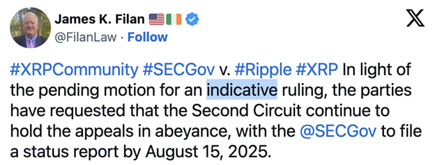 Những diễn biến pháp lý xoay quanh vụ kiện XRP với SEC vẫn có ảnh hưởng lớn đối với dự báo giá. Dù phán quyết tóm tắt ban đầu đã làm rõ XRP không phải là chứng khoán với giao dịch chương trình, vụ án vẫn chưa kết thúc. Ngày 17/6, luật sư James K Filan tiết lộ trên X rằng SEC đã yêu cầu Tòa phúc thẩm Hoa Kỳ Khu vực 2 tạm dừng kháng cáo do đang chờ quyết định sơ bộ tại tòa án quận. SEC sẽ nộp báo cáo cập nhật vào ngày 15/8, tiếp tục kéo dài cuộc chiến pháp lý nhiều năm này.