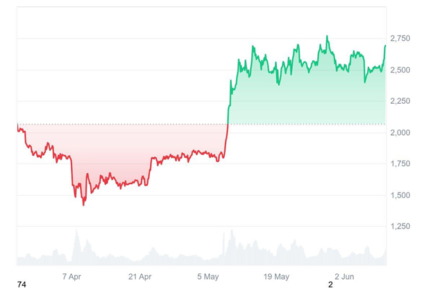 Ethereum (ETH), đồng tiền mã hóa lớn thứ hai thế giới theo vốn hóa thị trường, đang cho thấy nhiều tín hiệu tích cực khi bước vào giữa năm 2025. Sau cú bứt phá mạnh mẽ vào tháng 5 nhờ các nâng cấp kỹ thuật quan trọng và sự quan tâm từ các tổ chức lớn, ETH hiện đang giao dịch ổn định trong vùng $2,400–$2,700. Tính đến ngày 10/06/2025, Ethereum đạt mốc khoảng $2,690 — tăng 8% chỉ trong một ngày — cho thấy sự trở lại mạnh mẽ của sự quan tâm từ giới đầu tư và trader.