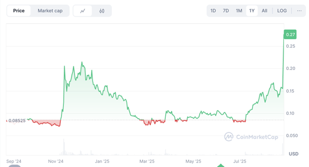 Đến cuối tháng 8 năm 2025, bối cảnh lại thay đổi khi Trump Media & Technology Group tiết lộ kế hoạch dùng Cronos làm tài sản dự trữ kho bạc. Sau khi xác nhận chiến lược quan trọng này, khối lượng giao dịch CRO tăng vọt, giá token tăng gần 30% chỉ trong vài giờ – từ khoảng $0.17 lên sát mức $0.22 trước khi xuất hiện một số động thái chốt lời.
