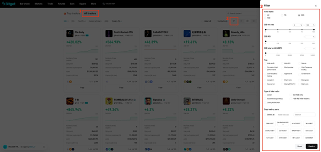 Lưu ý: menu bộ lọc có thể được tìm thấy bằng cách nhấp vào nút Bộ lọc trên trang tất cả nhà giao dịch futures / spot.