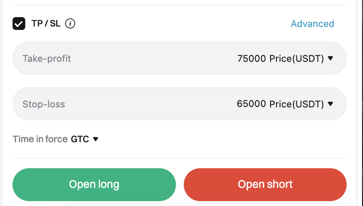 Giả sử bạn mua Bitcoin với giá 70,000 USDT. Nếu bạn đặt Chốt lời/Cắt lỗ dựa trên các giá trị được hiển thị ở trên, điều này có nghĩa là lệnh chốt lời sẽ được kích hoạt khi giá Bitcoin tăng lên 75,000 USDT và lệnh cắt lỗ sẽ được kích hoạt khi giá Bitcoin giảm xuống 65,000 USDT.