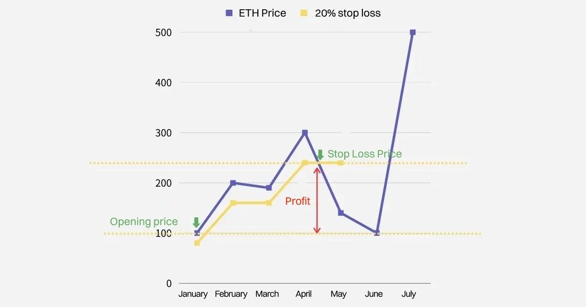 Tháng 4: Giá tăng lên 300 USDT, với giá cắt lỗ là 300 × (1 – 20%) = 240 USDT.