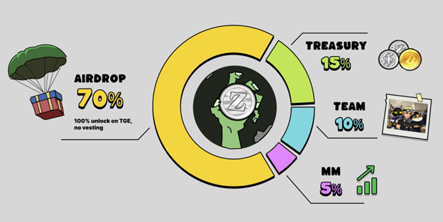 70% nguồn cung được airdrop trực tiếp đến người chơi, không khóa vesting, đảm bảo tính minh bạch và ưu tiên cộng đồng.