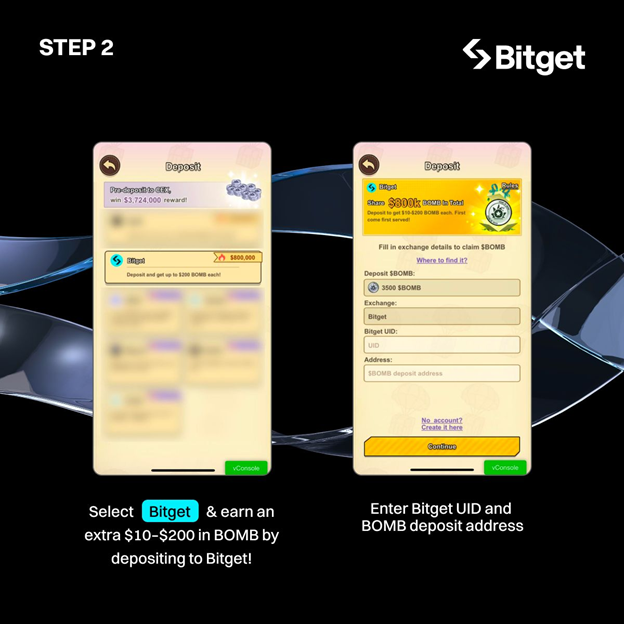 Chọn Bitget, nhập UID Bitget và địa chỉ ví nạp BOMB, sau đó nhấn “Continue”.