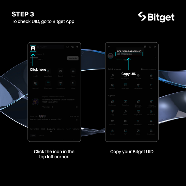 Để lấy UID, truy cập Trung tâm người dùng trên Bitget, sao chép và dán vào trang nạp BOMB của Bombie.
