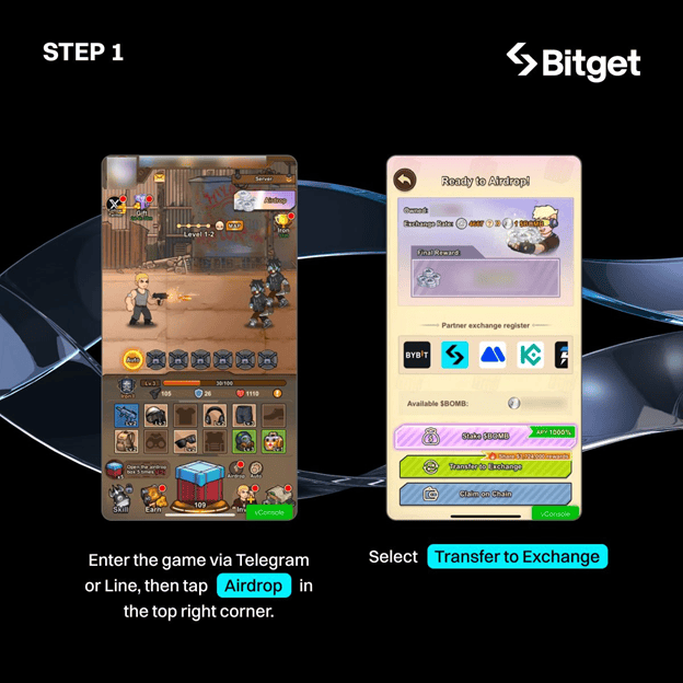 Truy cập game Bombie trên Telegram hoặc Line, chọn mục Airdrop, sau đó nhấn Transfer to Exchange.