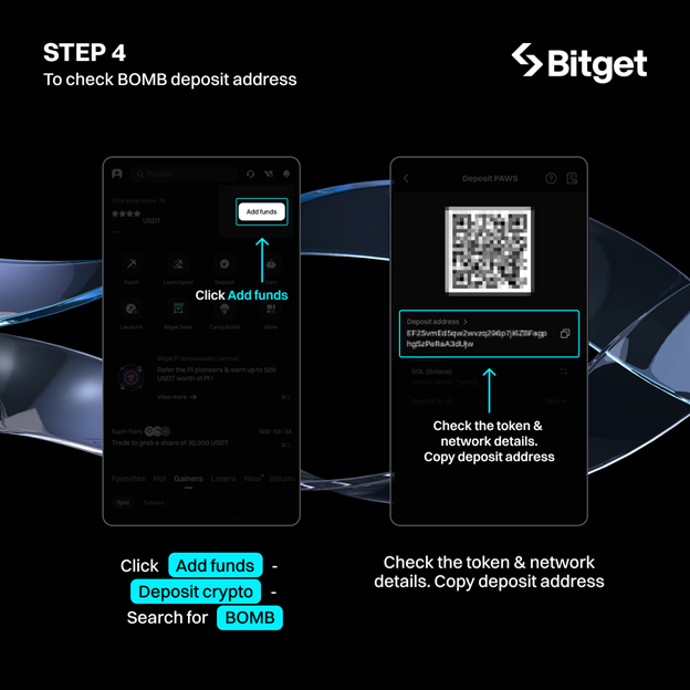Truy cập mục Add Funds trên Bitget → chọn Deposit Crypto → tìm kiếm “BOMB” → chọn token BOMB → sao chép địa chỉ ví và dán vào game.