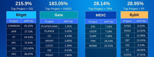 Một báo cáo so sánh dữ liệu mới nhất về mức APR (Tỷ suất lợi nhuận hàng năm) giữa các sàn giao dịch hàng đầu như Bitget, Gate, MEXC và Bybit đã hé lộ một sự thật bất ngờ: Có một khoảng cách mênh mông về lợi nhuận giữa người dẫn đầu và phần còn lại. Và cái tên đang thống trị bảng xếp hạng này không ai khác chính là Bitget.