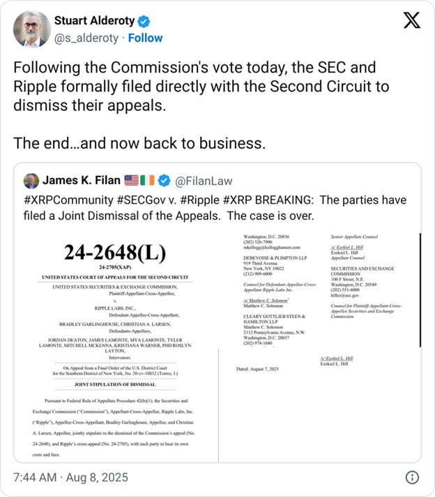 Ông Stuart Alderoty, Giám đốc pháp lý của Ripple, đã đăng trên X: “Sau cuộc bỏ phiếu của Ủy ban hôm nay, SEC và Ripple đã chính thức nộp đơn trực tiếp lên Tòa phúc thẩm Khu vực 2 để rút lại các kháng cáo của mình”.